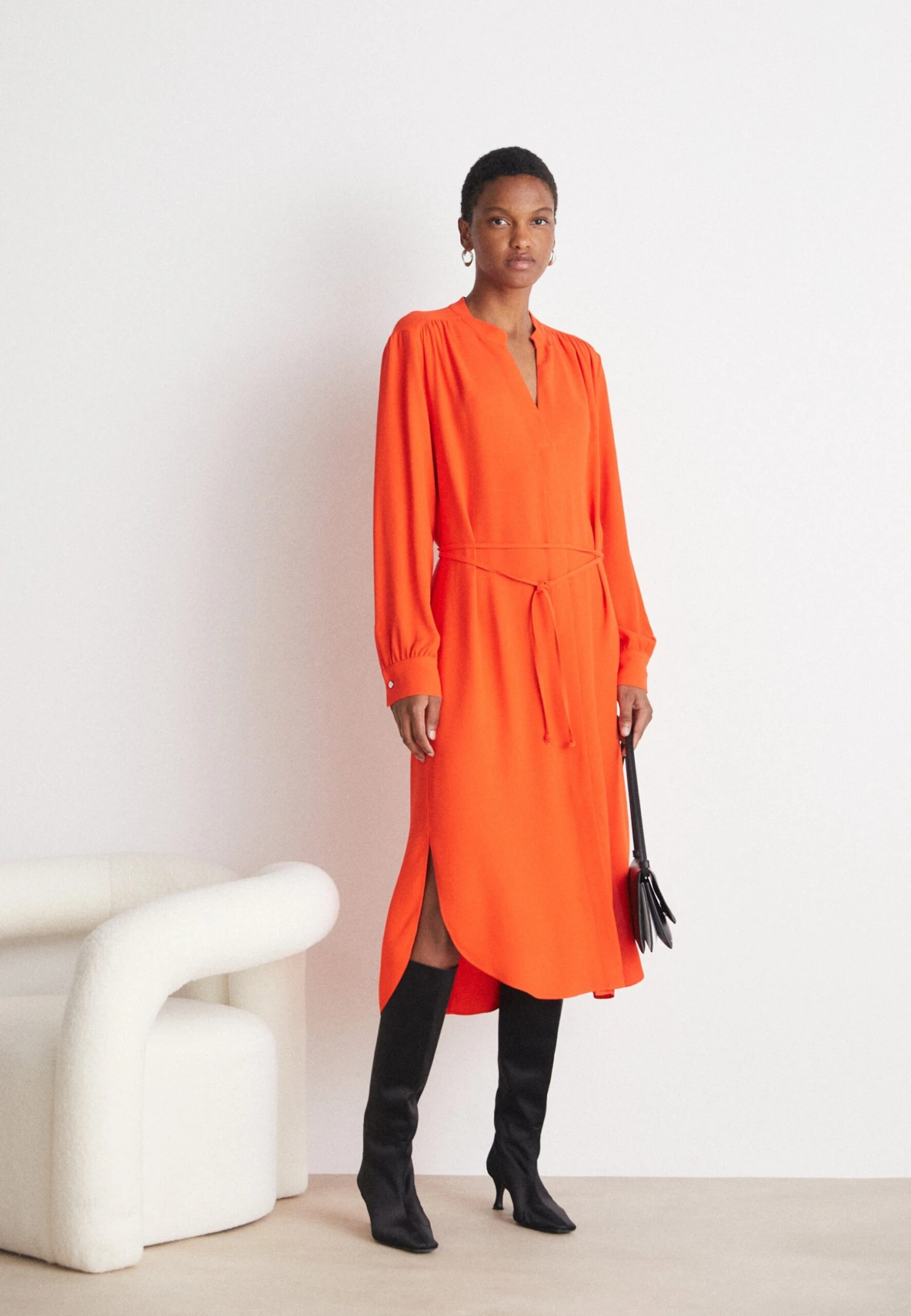Boss Belted Shirt Dress With Collarless Styling And Button Cuffs – Jurk – Bright Orange